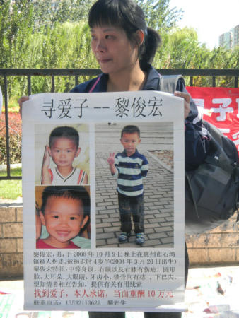 “Los traficantes están por todas partes,” dijo entre sollozos Chen Fengdiao, de 32 años. Con un cartel entre las manos, se arrodilló en la acera, pidiendo a los traseúntes que le ayudaran a encontrar a Li Junhong, su hijo de cuatro años, quien fuera secuestrado el 9 de octubre de 2008, cuando jugaba fuera de su hogar en Huizhou, provincia de Guangdong.